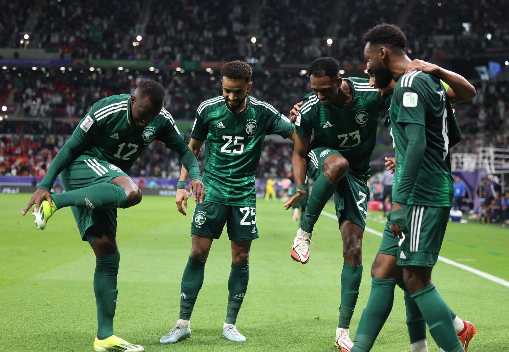 1月21日,沙特阿拉伯队球员穆罕默德·卡努(左三)进球后与队友庆祝。新华社记者 曹灿 摄
