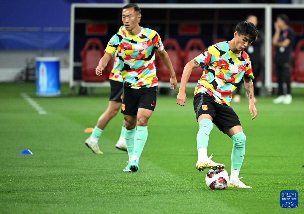 1月22日,中国队球员林良铭(左)、武磊(中)、戴伟浚在赛前踩场。新华社记者 贾浩成 摄