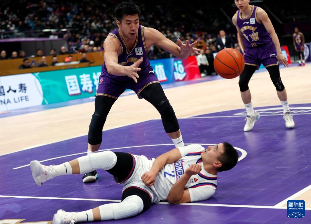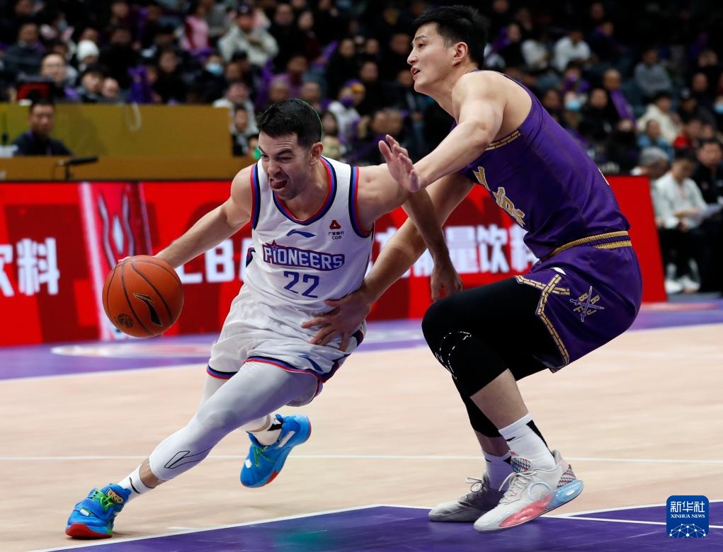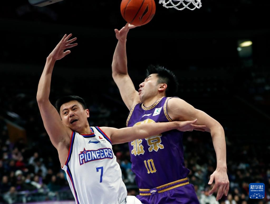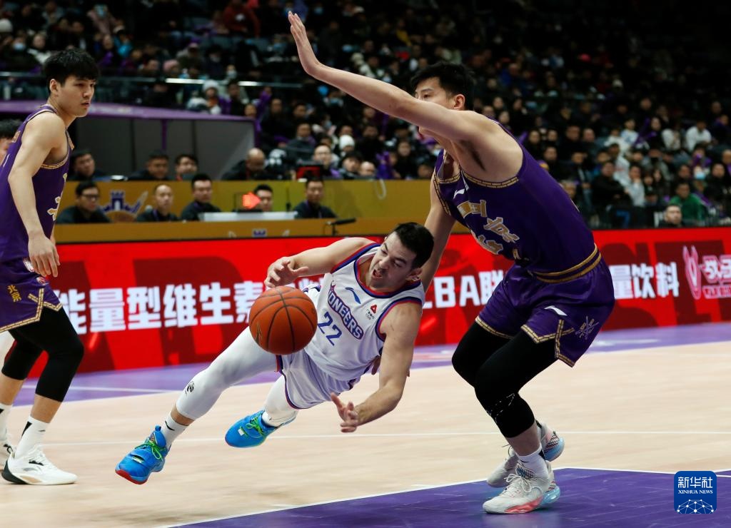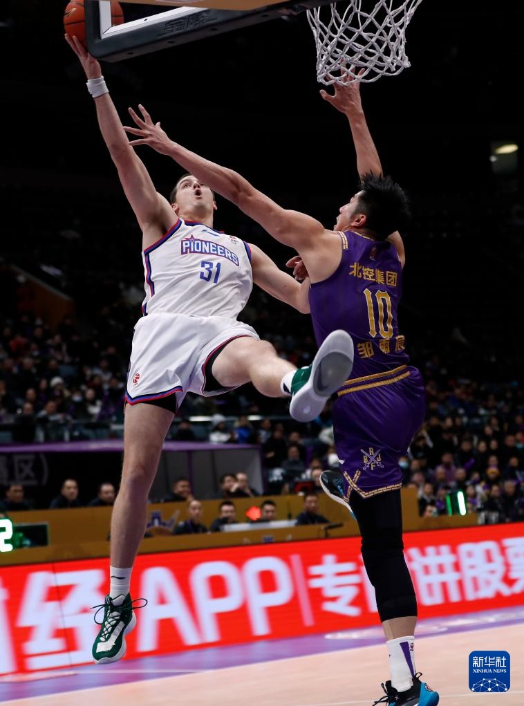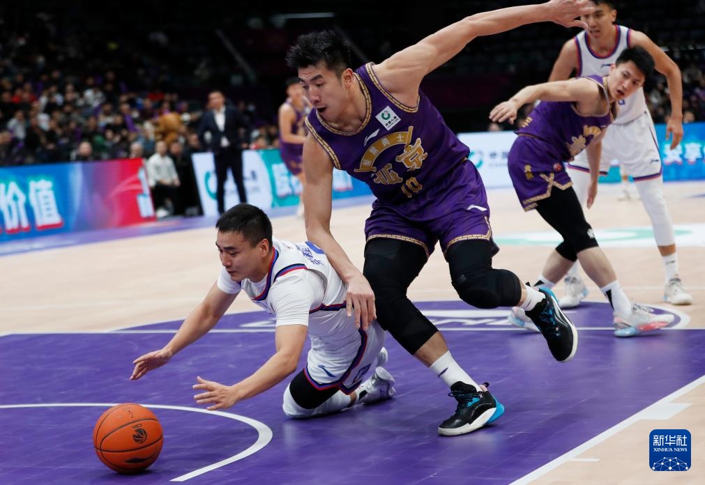 1月22日,北京控股队球员邹雨宸(上)与天津先行者队球员王旭(下)在比赛中拼抢。新华社记者 雒圆 摄