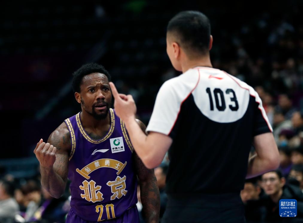 1月22日,北京控股队球员费尔德(左)在比赛中向裁判申诉。新华社记者 雒圆 摄