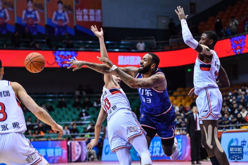 1月22日,山东高速队球员吉伦沃特(右二)在比赛中传球。新华社记者 朱峥 摄
