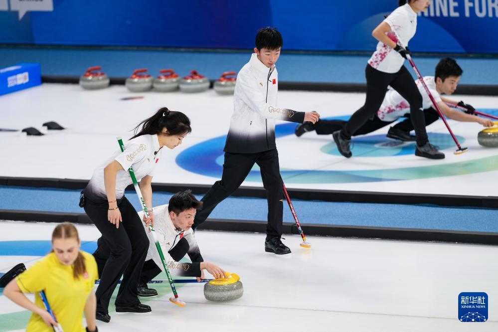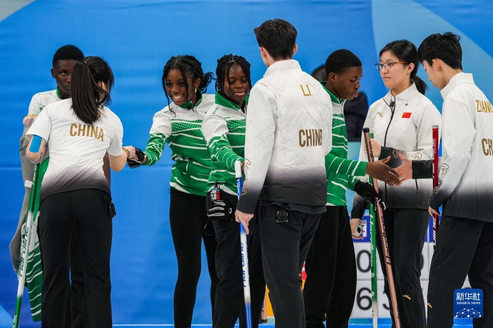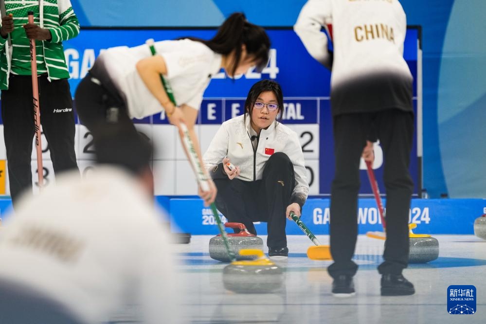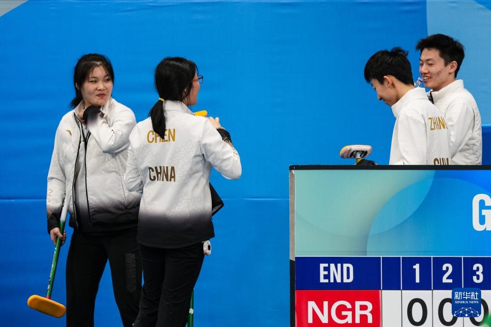 当日,在韩国江陵举行的2024年江原道冬青奥会冰壶混合团体循环赛中,中国队22比2战胜尼日利亚队。