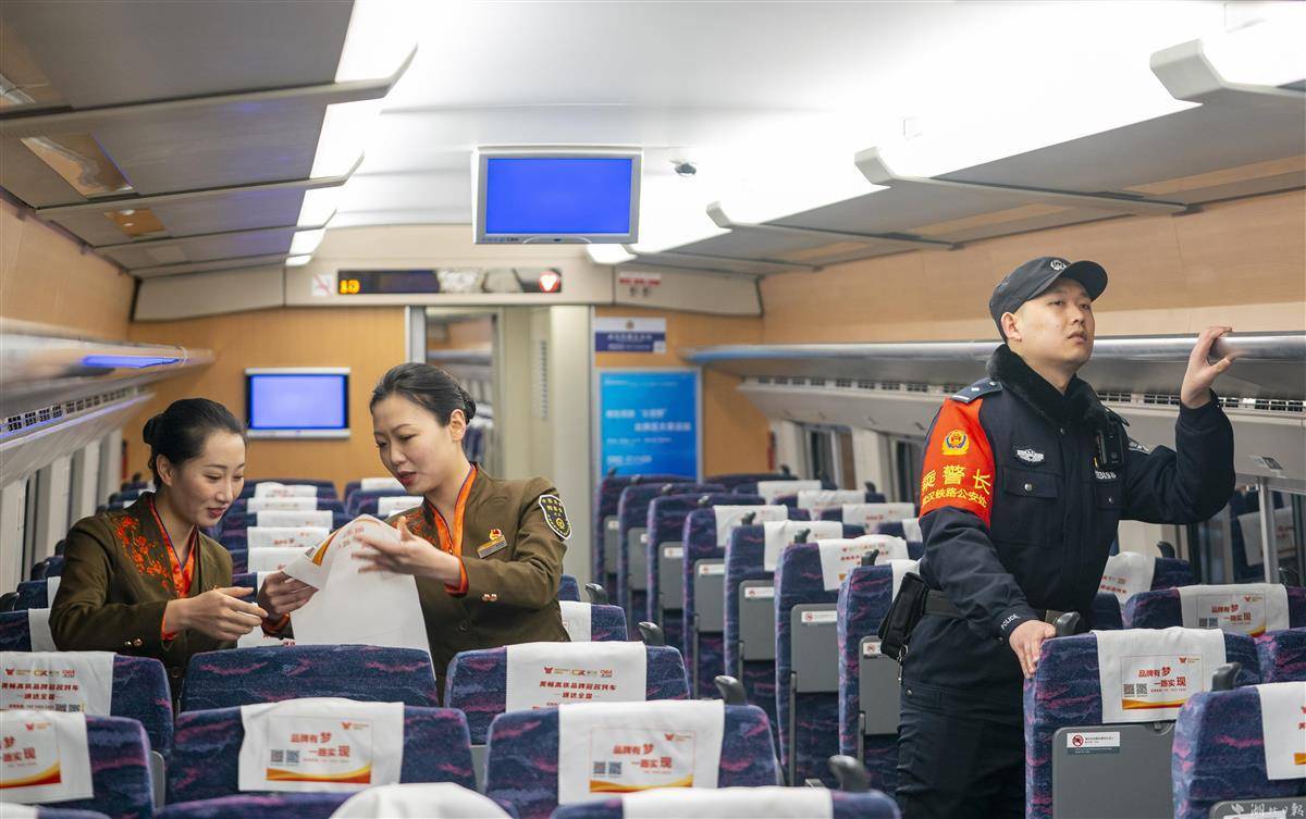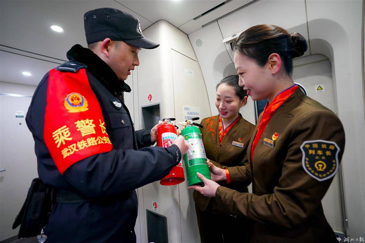 1月22日,一列即将启动的动车组上,乘警和列车乘务员仔细检查车厢和消防器材。春运大幕即将开启,武汉铁路公安局强化对中国铁路武汉局集团有限公司动车段内停靠的全部动车组和站场进行安全检查、巡逻,确保高铁动车组绝对安全。同时加强高铁乘务员和检修人员安全检查流程培训。根据计划安排,春运期间,武汉铁路部门单日最高开行旅客列车667.5对来应对客流高峰。2024年春运将从1月26日开始,3月5日结束,共计40天。