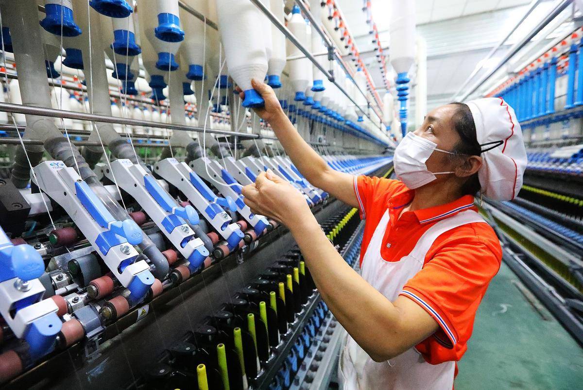 十堰市房县纺织工业产业园恒达纺织有限公司,工人在纺织车间生产高端紧密纺纱线。(视界网 张启龙 摄)