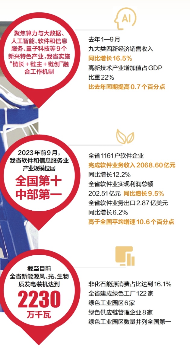 不断融合的“三链”激活新动能、拓展新领域、开辟新赛道。2023年前三季度,全省规上工业增加值同比增长5.6%,高于全国1.6个百分点,规上工业企业新增、净增和总量均创历史新高;全国专精特新“小巨人”企业总数从中部第四跃升中部第一;9个新兴特色产业竞相发展,2023年1—10月,软件和信息服务产业营收2321亿元,同比增长14.2%。