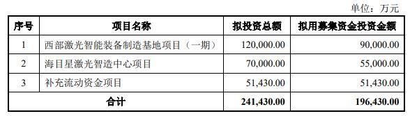 海目星激光科技集团股份有限公向特定对象发行A股股票预案(二次修订稿)显示,本次向特定对象发行股票募集资金总额不超过196,430.00万元(含本数),扣除发行费用后的募集资金净额计划用于西部激光智能装备制造基地项目(一期)、海目星激光智造中心项目、补充流动资金项目。