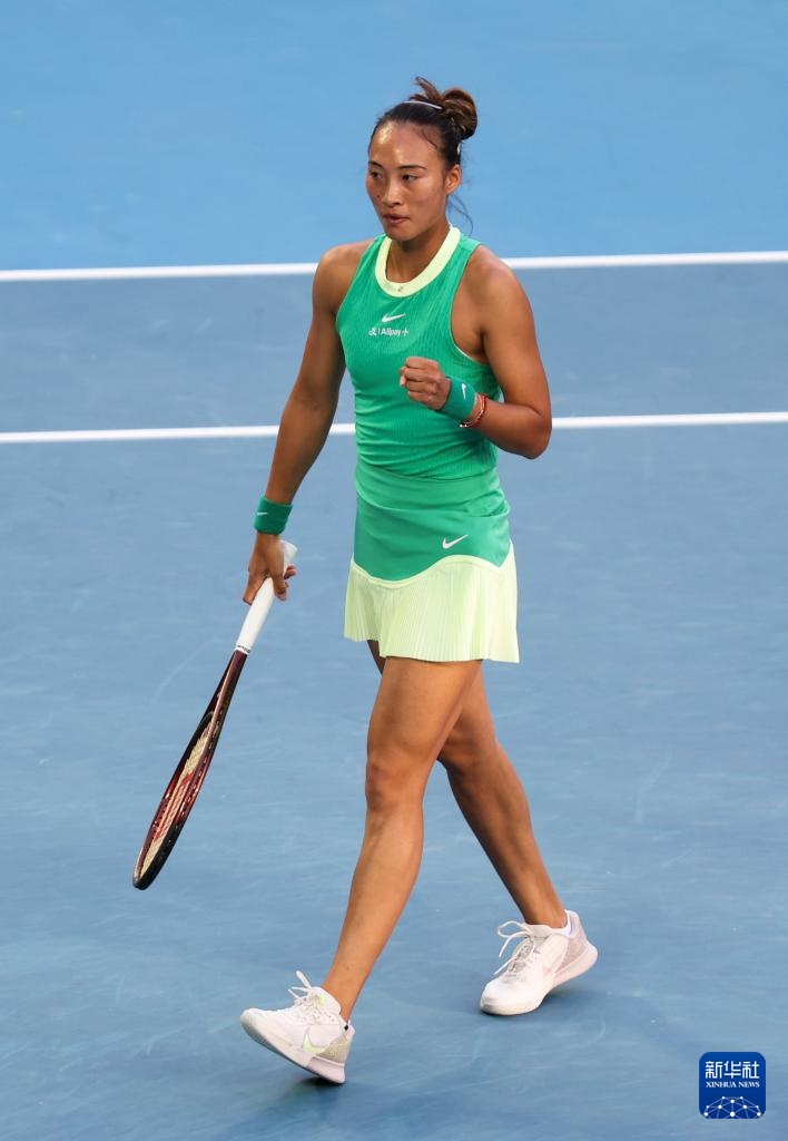 1月24日,郑钦文在比赛中庆祝得分。新华社记者 马平 摄