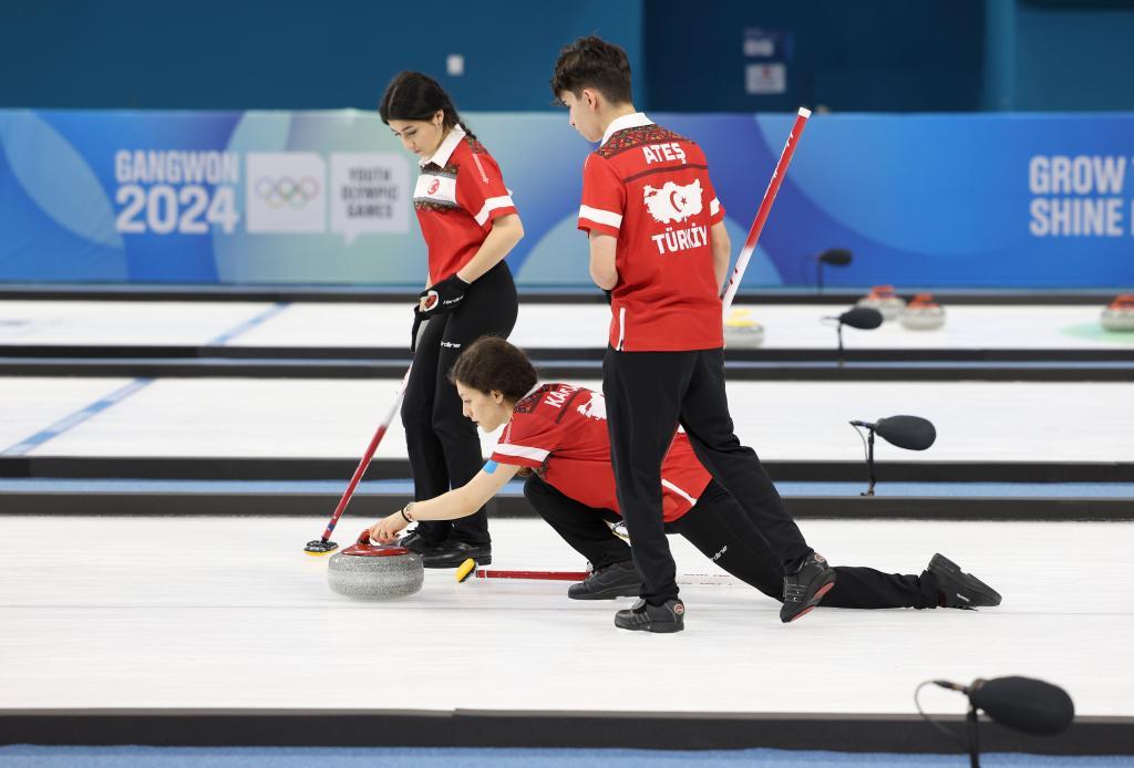 1月20日,土耳其队队员在冰壶混合团体项目的比赛中。新华社记者 胡虎虎 摄
