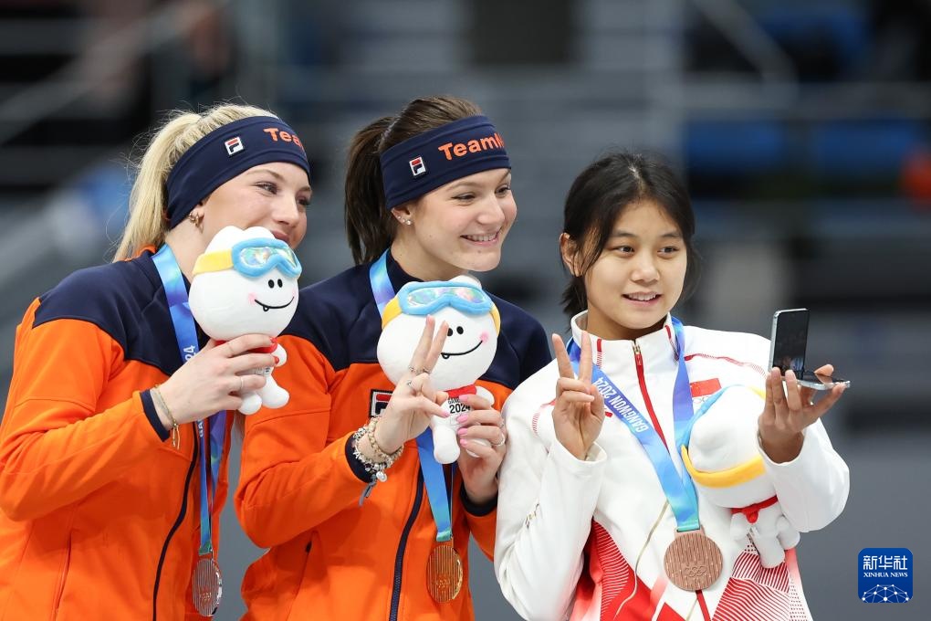 1月26日,亚军荷兰选手贾斯米金·韦恩赫斯、冠军荷兰选手安格尔·达勒曼和季军中国选手刘昀琪(从左至右)在颁奖仪式上合影。新华社记者 许雅楠 摄
