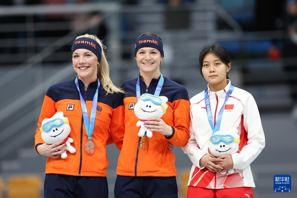 1月26日,亚军荷兰选手贾斯米金·韦恩赫斯、冠军荷兰选手安格尔·达勒曼和季军中国选手刘昀琪(从左至右)在颁奖仪式上。新华社记者 许雅楠 摄