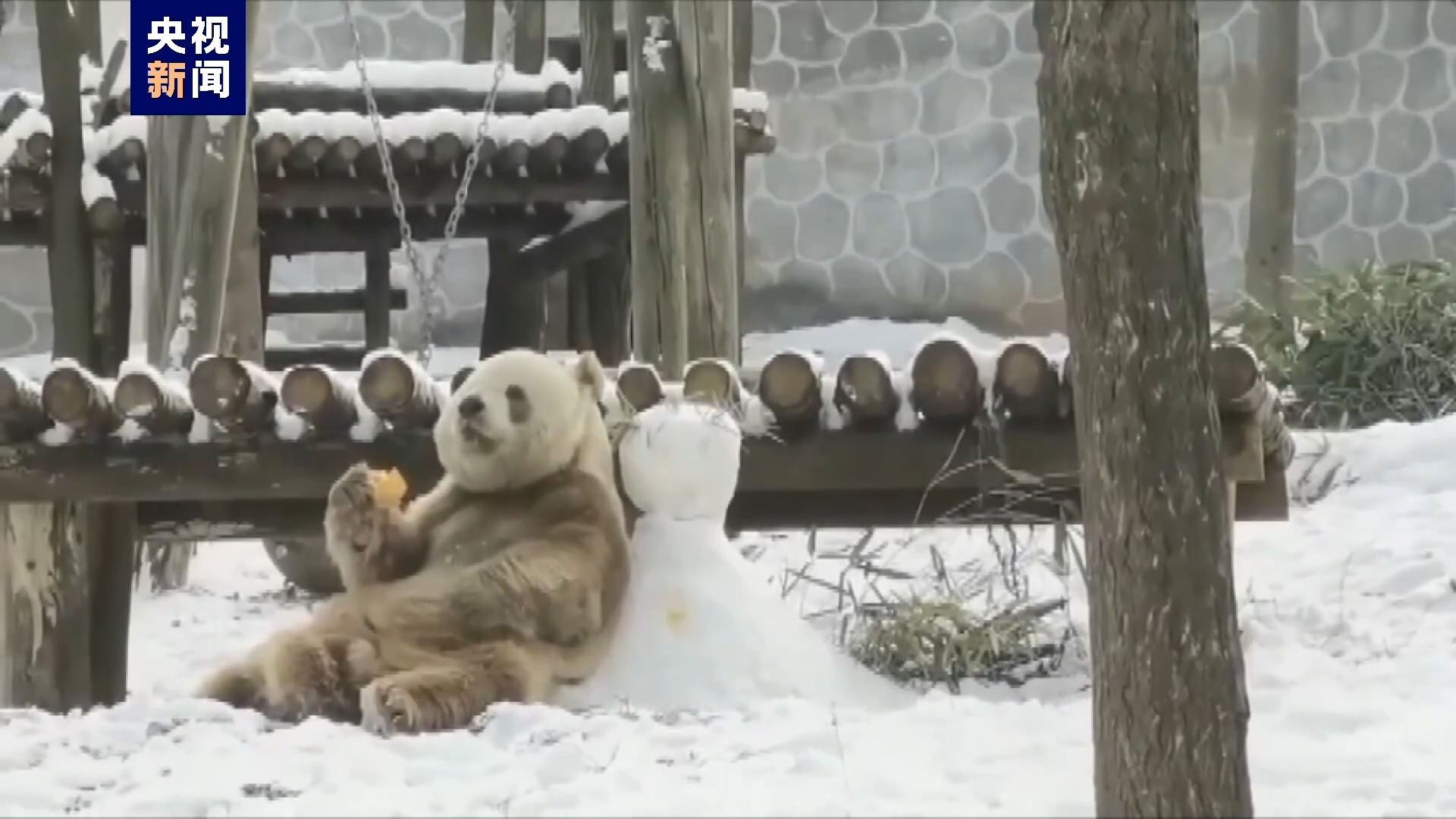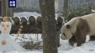 近日,一场降雪过后,位于秦岭北麓的秦岭大熊猫研究中心的大熊猫外舍积上了一层厚厚的白雪。保育员为全球唯一的一只圈养棕色大熊猫“七仔”专门堆了一个雪人,并用胡萝卜、苹果和南瓜进行装饰。“七仔”看到了会做什么呢?