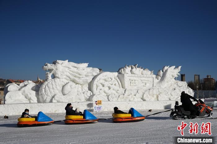 图为在西宁市城东区高原冰雪大世界内,载满游客的雪地鞋船从龙形雪雕前驶过。 马铭言 摄