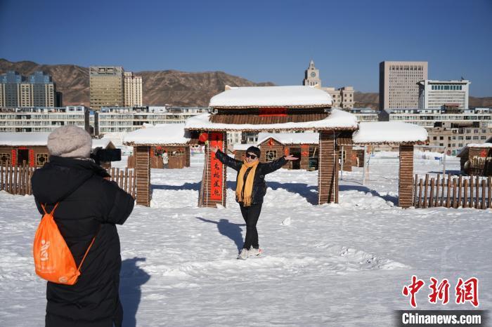 图为游客在西宁市城东区高原冰雪大世界打造的雪村前合影留念。 马铭言 摄