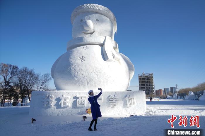 图为游客在西宁市城东区高原冰雪大世界14米高的巨型地标雪人前拍照留念。 马铭言 摄