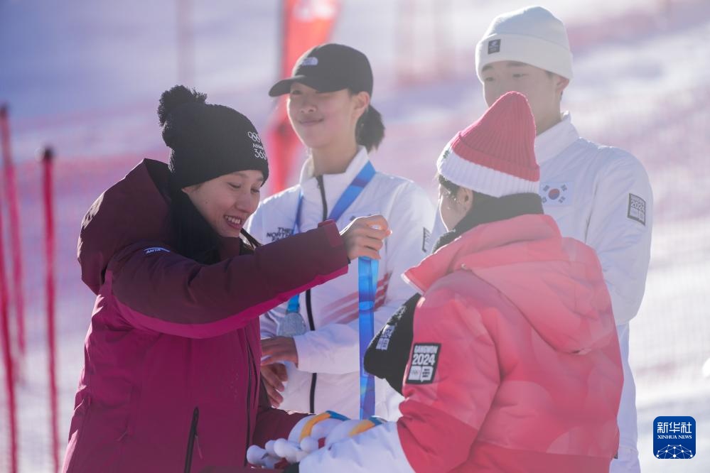 1月26日,颁奖嘉宾国际奥委会江原道冬青奥会协调委员会主席张虹(左一)为自由式滑雪获奖选手颁奖。新华社记者 张笑宇 摄