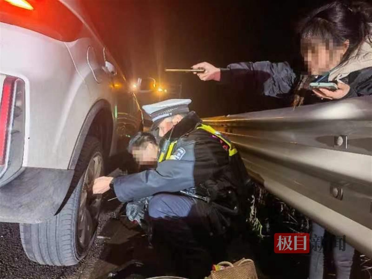 此时,一名男子蹲在右后轮旁忙碌着,一名女子焦急地站在护栏外,举着手机为男子照明。民警询问得知,两人是一对夫妻,当天从贵州驾车回河南,行至此处,小车右后轮突然爆胎。丈夫因为没有换轮胎的经验,一直无法拆下轮胎。