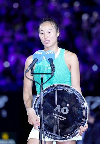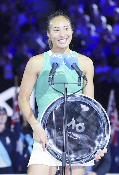 1月27日,在墨尔本进行的2024年澳大利亚网球公开赛女单决赛中,湖北21岁姑娘郑钦文获得亚军。赛后,湖北省政府特向中国网球协会和郑钦文发去贺电。图为郑钦文在颁奖仪式上。新华社发