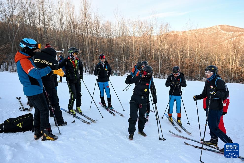 1月28日,在内蒙古呼伦贝尔市扎兰屯市金龙山滑雪场,教练员(右三)指导运动员训练。新华社记者 贝赫 摄