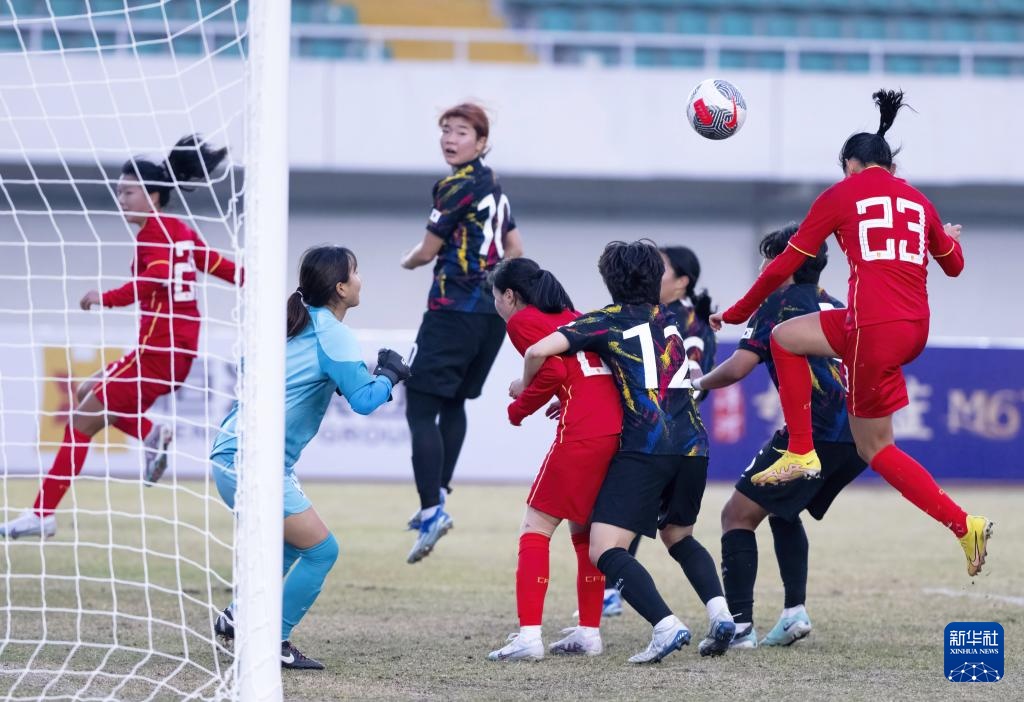 1月28日,中国队球员卢家玉(右一)头球攻门得分。新华社记者 魏培全 摄