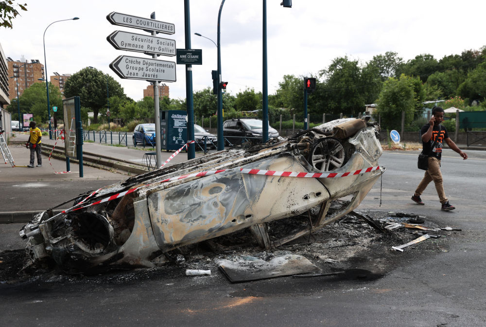 ↑2023年6月30日,在法国巴黎以北的欧贝维利耶,一辆汽车在夜间被示威者焚毁。27日在法国上塞纳省楠泰尔市,一名警员截停一辆汽车时开枪,驾车的17岁少年身亡。这一事件引起法国各界强烈反应。28日晚开始,法国多个城市出现不同程度的骚乱。