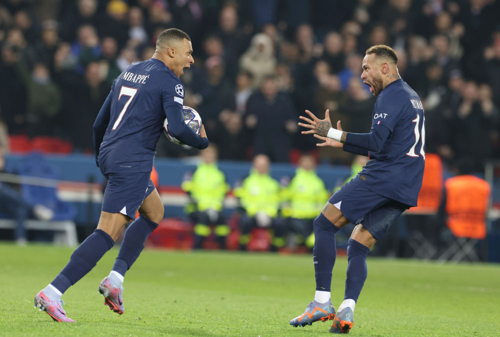 ↑2023年2月14日,巴黎圣日耳曼队球员姆巴佩进球后与内马尔庆祝,该进球在主裁判经过VAR(视频助理裁判)确认后被判无效。当日,在法国巴黎王子公园球场举行的2022-2023赛季欧洲足球冠军联赛八分之一决赛首回合比赛中,法甲巴黎圣日耳曼队主场以0比1不敌德甲拜仁慕尼黑队。