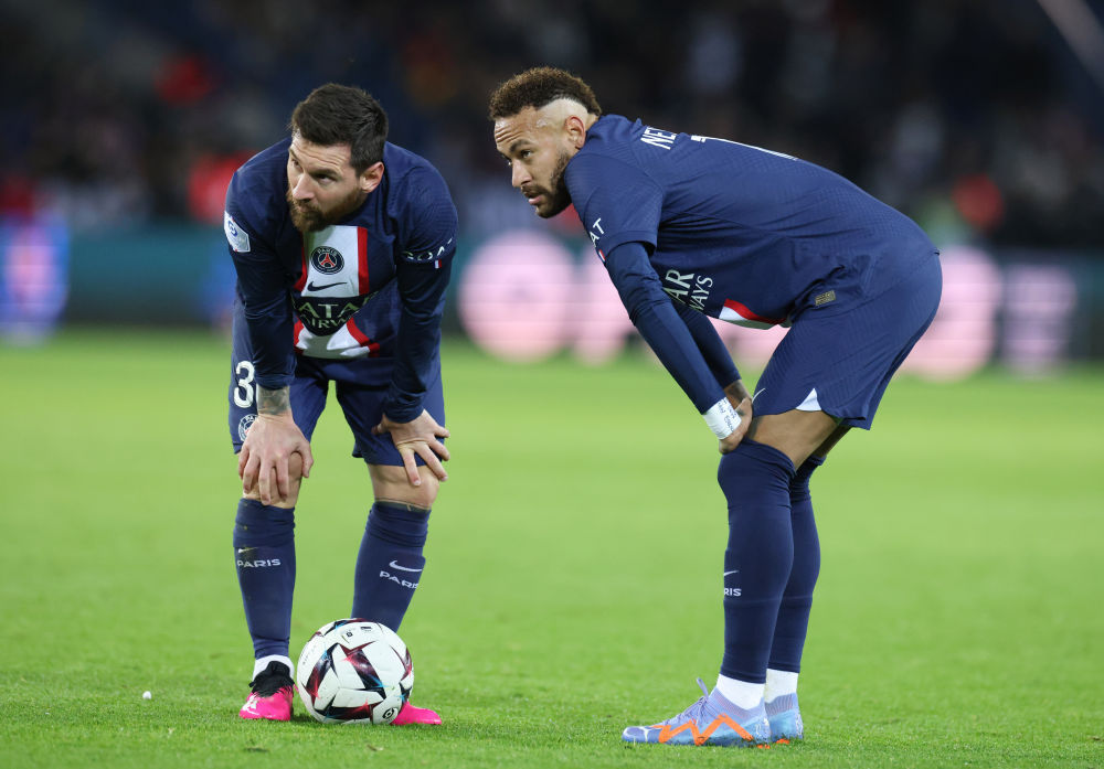 ↑2023年1月11日,巴黎圣日耳曼队球员梅西(左)和内马尔在比赛中。当日,在2022-2023赛季法国足球甲级联赛第18轮比赛中,巴黎圣日耳曼队主场以2比0战胜昂热队。