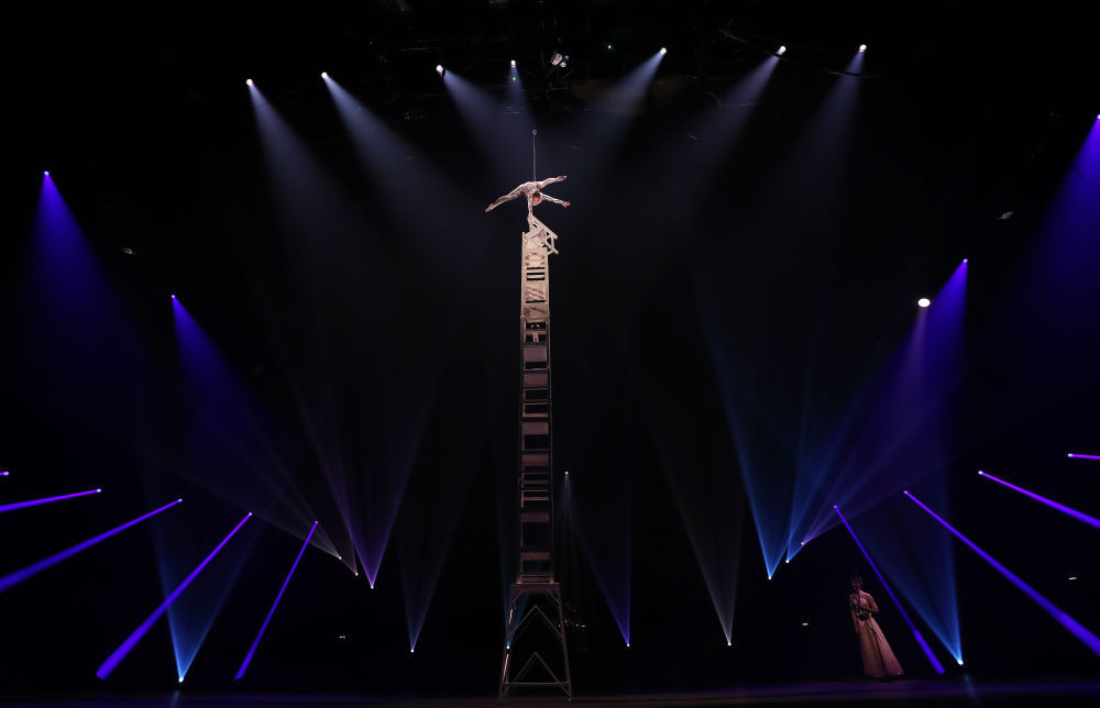 ↑2023年12月8日,演员在法国巴黎举行的中国杂技“奇妙之夜”演出上表演《高椅》。
