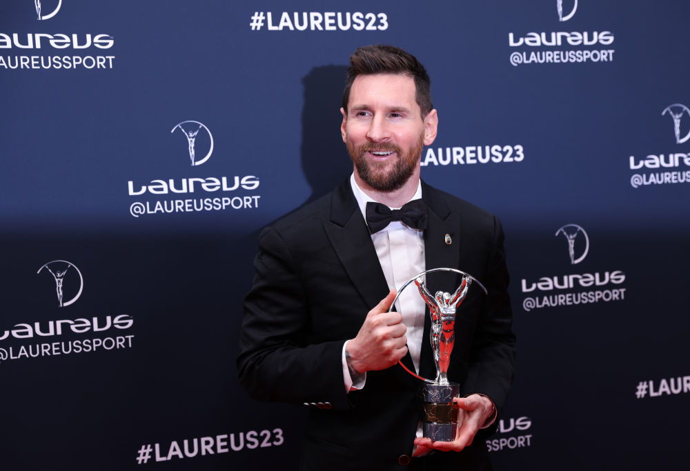 ↑2023年5月8日,在法国巴黎举行的2023年劳伦斯世界体育奖颁奖典礼上,获得最佳男子运动员奖的梅西展示奖杯。