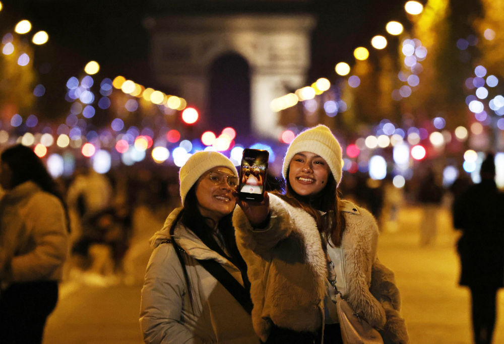 ↑2023年11月19日,人们在法国巴黎点灯后的香榭丽舍大街上拍照留念。 当日,法国巴黎著名的香榭丽舍大街迎来一年一度的点灯仪式。