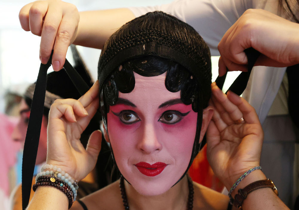 ↑2023年9月9日,在法国巴黎中国文化中心,法国观众体验昆曲旦角扮相。