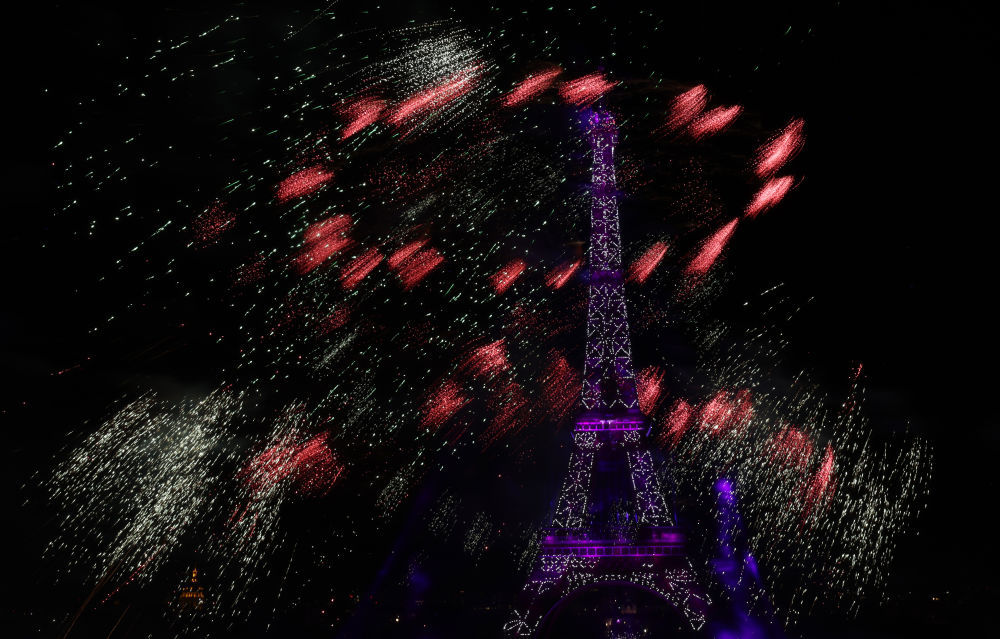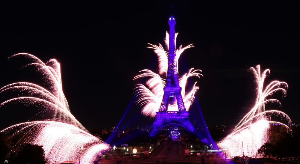 ↑2023年7月14日,焰火在法国巴黎埃菲尔铁塔周围绽放。