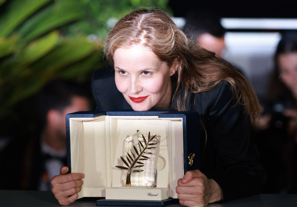 ↑2023年5月27日,在法国戛纳,法国导演朱斯蒂娜·特里耶展示“金棕榈奖”奖杯。