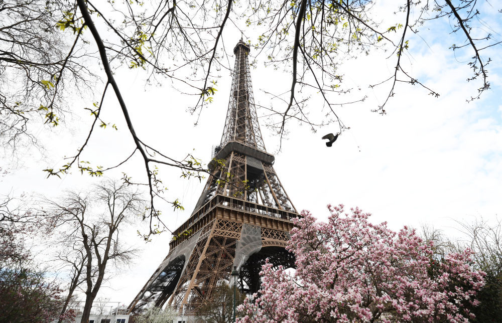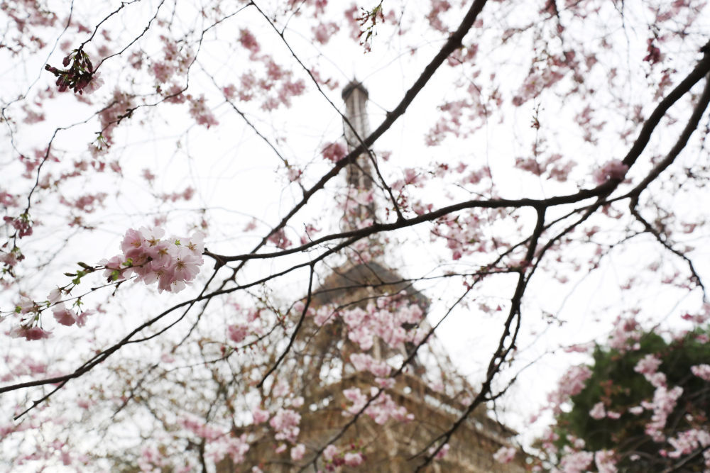 ↑2023年3月19日,法国巴黎埃菲尔铁塔下春花绽放。