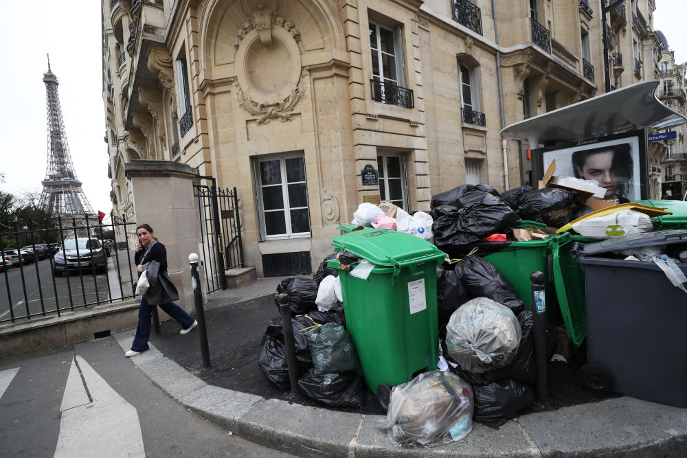 ↑2023年3月17日,一名女子经过法国巴黎埃菲尔铁塔附近无人清理的垃圾。
