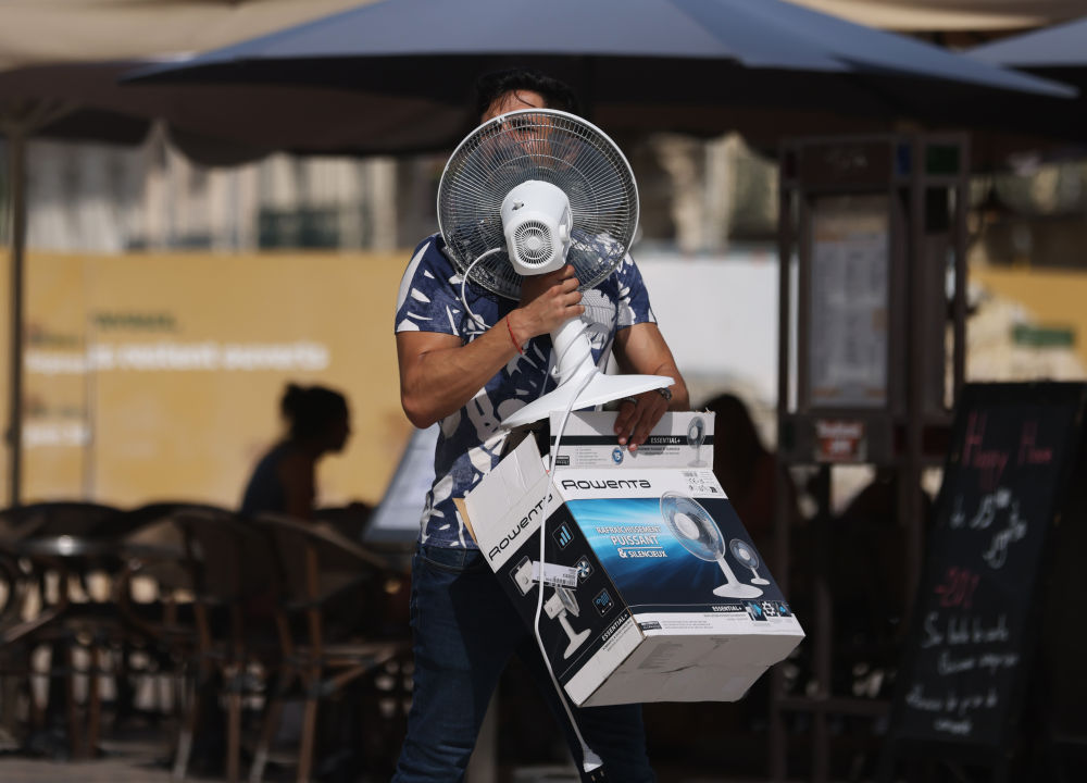 ↑2023年7月19日,一名男子搬着电风扇走在法国南部城市蒙彼利埃街头。