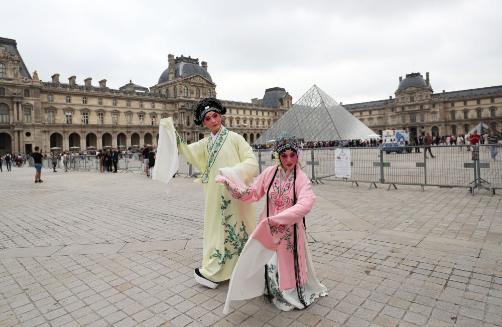 ↑2023年9月13日,江苏省演艺集团昆剧院院长施夏明(左)和江苏省演艺集团昆剧院国家一级演员孔爱萍在法国巴黎卢浮宫金字塔广场上参加昆曲快闪。