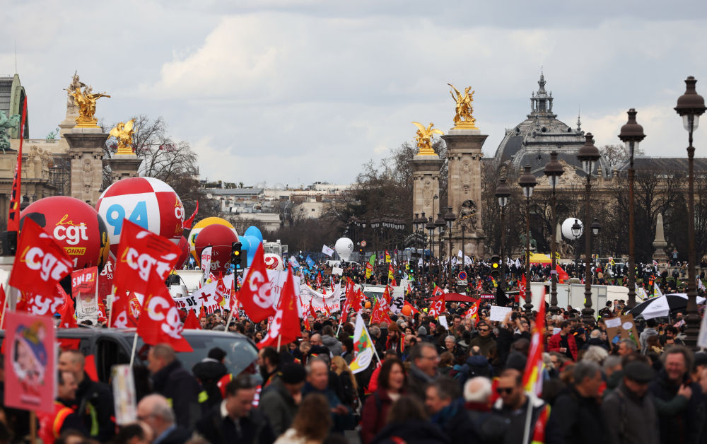 ↑2023年3月15日,人们在法国巴黎荣军院广场上参加第八轮反退休制度改革大游行。