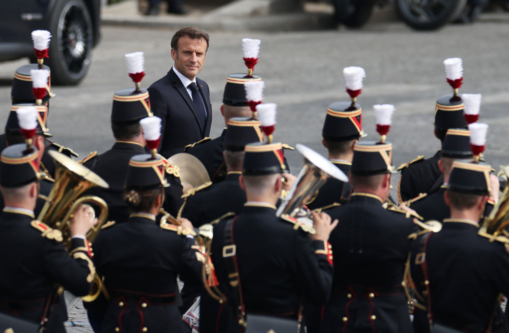 ↑2023年7月14日,法国总统马克龙在巴黎协和广场的以“士气”为主题的国庆阅兵式现场检阅仪仗队。