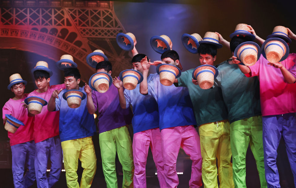 ↑2023年12月8日,演员在法国巴黎举行的中国杂技“奇妙之夜”演出上表演《草帽》。