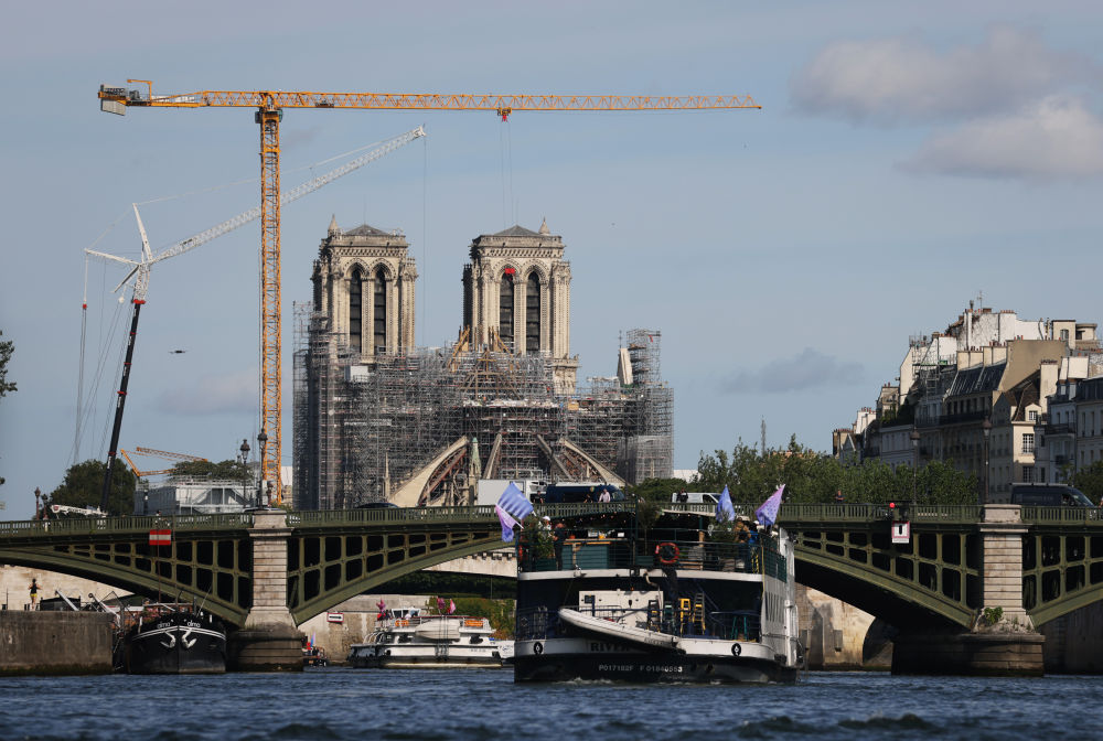 ↑2023年7月17日,船艇参加彩排时经过修复中的巴黎圣母院。当日,巴黎奥组委在法国塞纳河上进行了一场奥运会开幕式迷你彩排。57艘船参与了这次彩排,数量相当于正式开幕式的近一半,其中39艘船为各体育代表团船只,另18艘船为服务船只(协助船、医疗救援船、OBS转播船)。