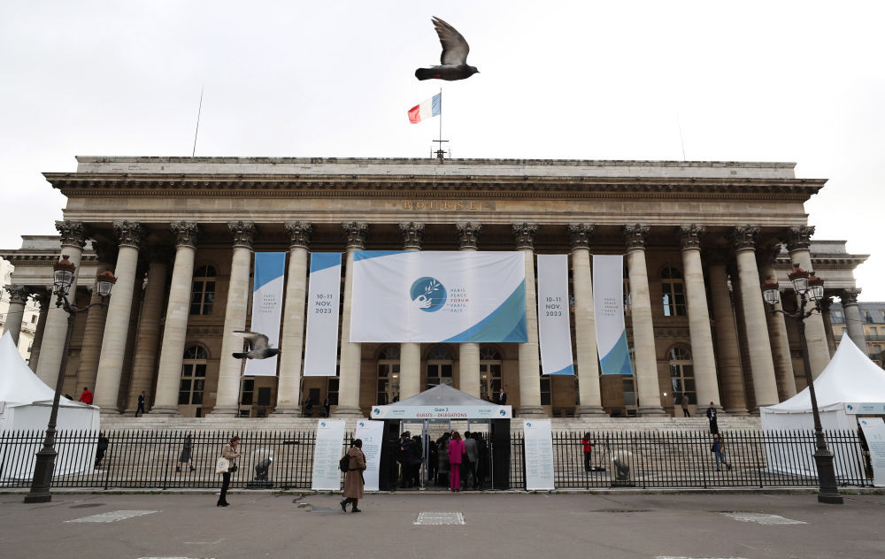 ↑2023年11月10日,鸽子飞过法国巴黎和平论坛会场。
