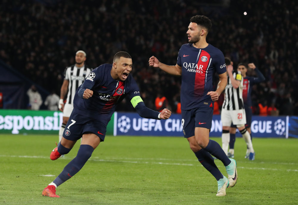 ↑2023年11月28日,巴黎圣日耳曼队球员姆巴佩(左)在比赛中庆祝进球。