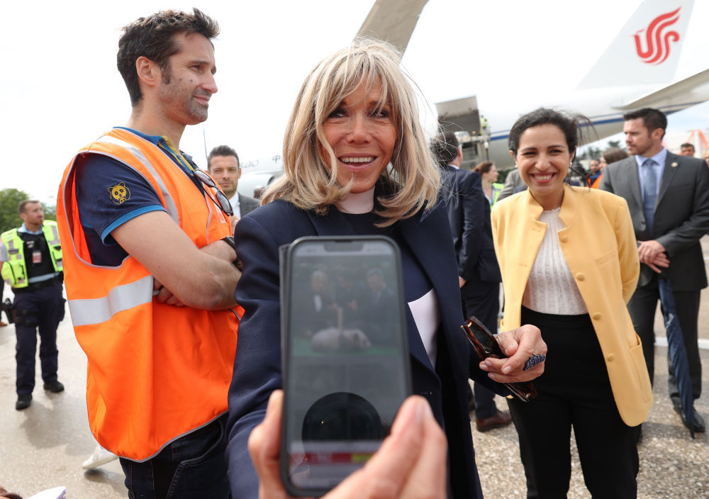 ↑2023年7月25日,在法国巴黎戴高乐机场,法国总统夫人布丽吉特·马克龙用手机展示她与大熊猫“圆梦”的合影。
