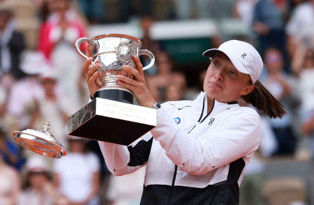 ↑2023年6月10日,斯维亚特克举起“苏珊·朗格朗杯”时不慎将盖子掉落。当日,在2023法国网球公开赛女单决赛中,波兰选手斯维亚特克以2比1战胜捷克选手穆霍娃,获得冠军。
