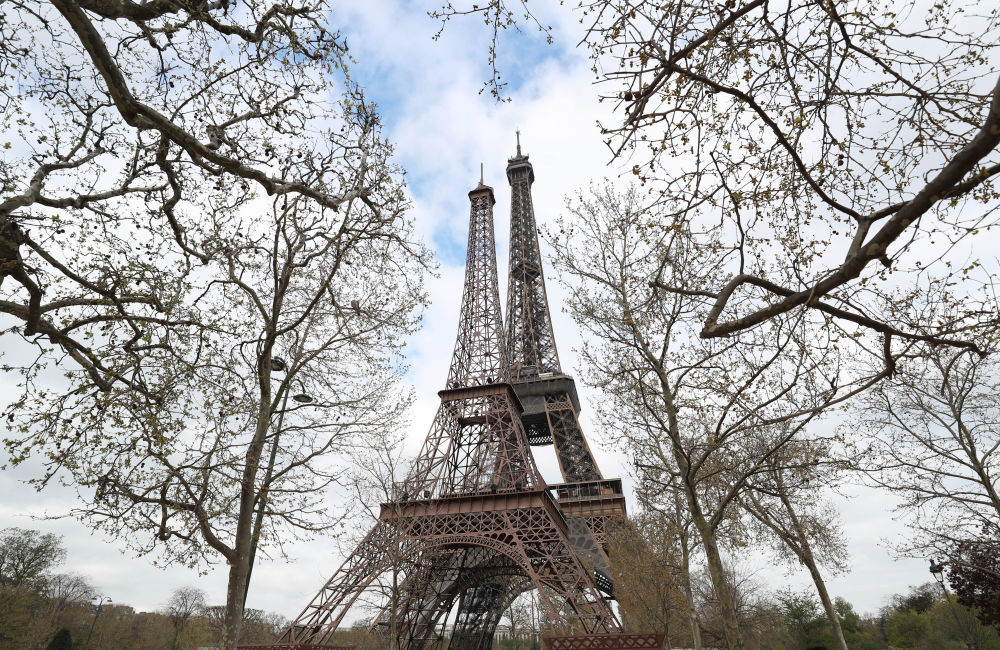 ↑这是2023年4月3日在法国巴黎拍摄的埃菲尔铁塔(后)和“小埃菲尔铁塔”。艺术家菲利普·曼德龙制作的“小埃菲尔铁塔”是法国巴黎地标建筑——埃菲尔铁塔十分之一大小的复制品,在原作附近展出到4月10日。