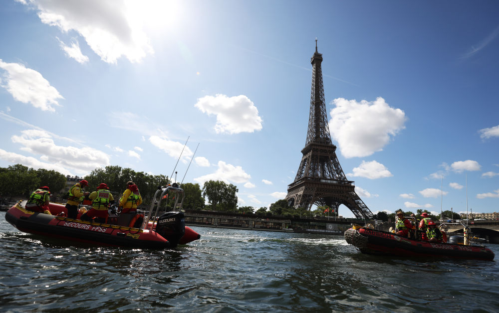 ↑2023年7月17日,参加奥运会开幕式迷你彩排的船艇抵达埃菲尔铁塔脚下。