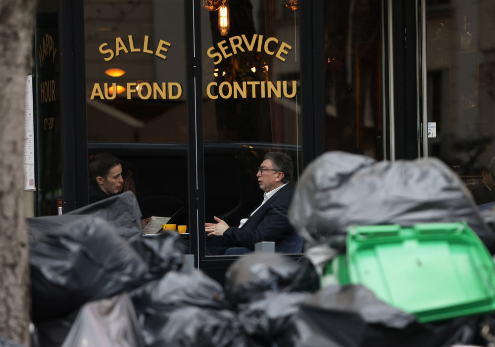 ↑2023年3月15日,人们在法国巴黎一家门口堆满垃圾的餐馆用餐。