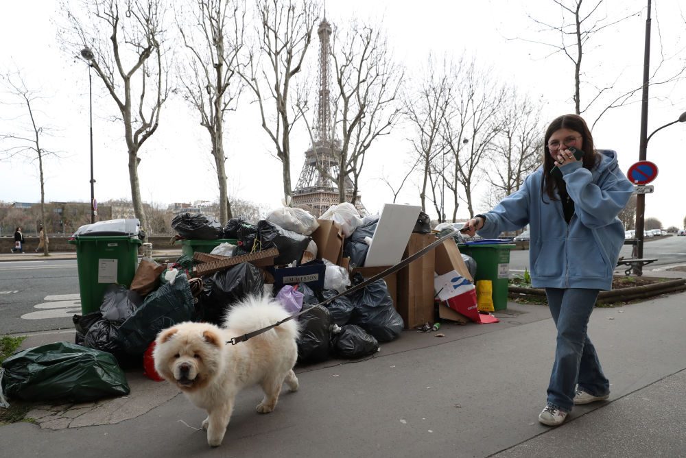 ↑2023年3月15日,一名女子牵狗走过法国巴黎埃菲尔铁塔附近无人清理的垃圾。
