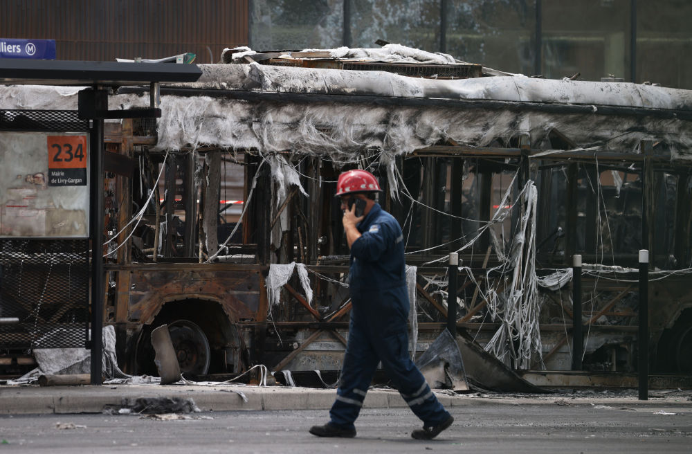 ↑2023年6月30日,在法国巴黎以北的欧贝维利耶,工作人员在一处被纵火破坏的公交总站现场忙碌。