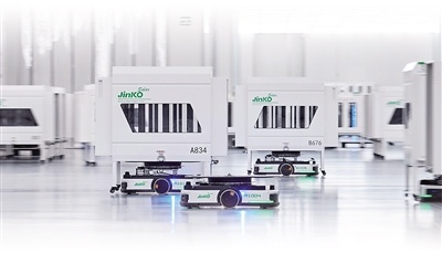 浙江省海宁市,晶科能源股份有限公司的智能光伏电池生产车间里,自动导引运输车来回穿梭。 晶科能源股份有限公司供图 |